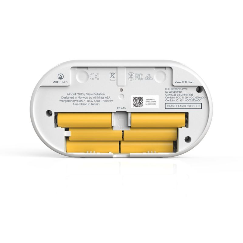 Airthings View Pollution zahrnuje bezplatnou aplikaci (iOS / Android) a je napájen z baterie nebo přes USB kabel.
