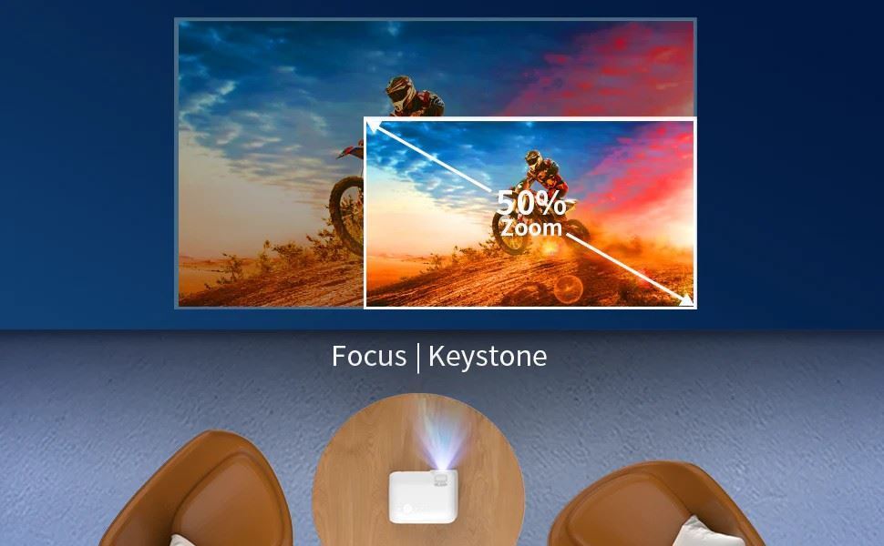 Full HD filmový projektor apeman LC700 vybavený ±15° 4D korekcí lichoběžníkového zkreslení účinně snižuje vertikální nebo horizontální zkreslení obrazu. Funkce digitálního zoomu umožňuje, aby velikost projekčního plátna projektoru mohla být individuálně upravena pomocí dálkového ovládání, aniž by se často měnila projekční vzdálenost.