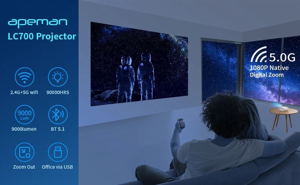 APEMAN Projektor LC700 1080P, Full HD je přenosný projektor pro domácí sledování filmů či sportoních přenosů nebo venkovní kino.