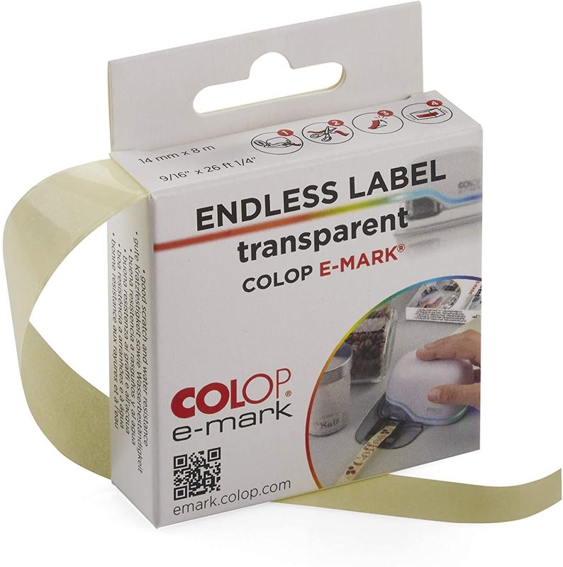 COLOP e-mark® nalepovací páska transparentní, 14mm x 8m (pro Professional, GO). Nalepovací průhledná páska, která je odolná proti poškrábání a stříkající vodě.