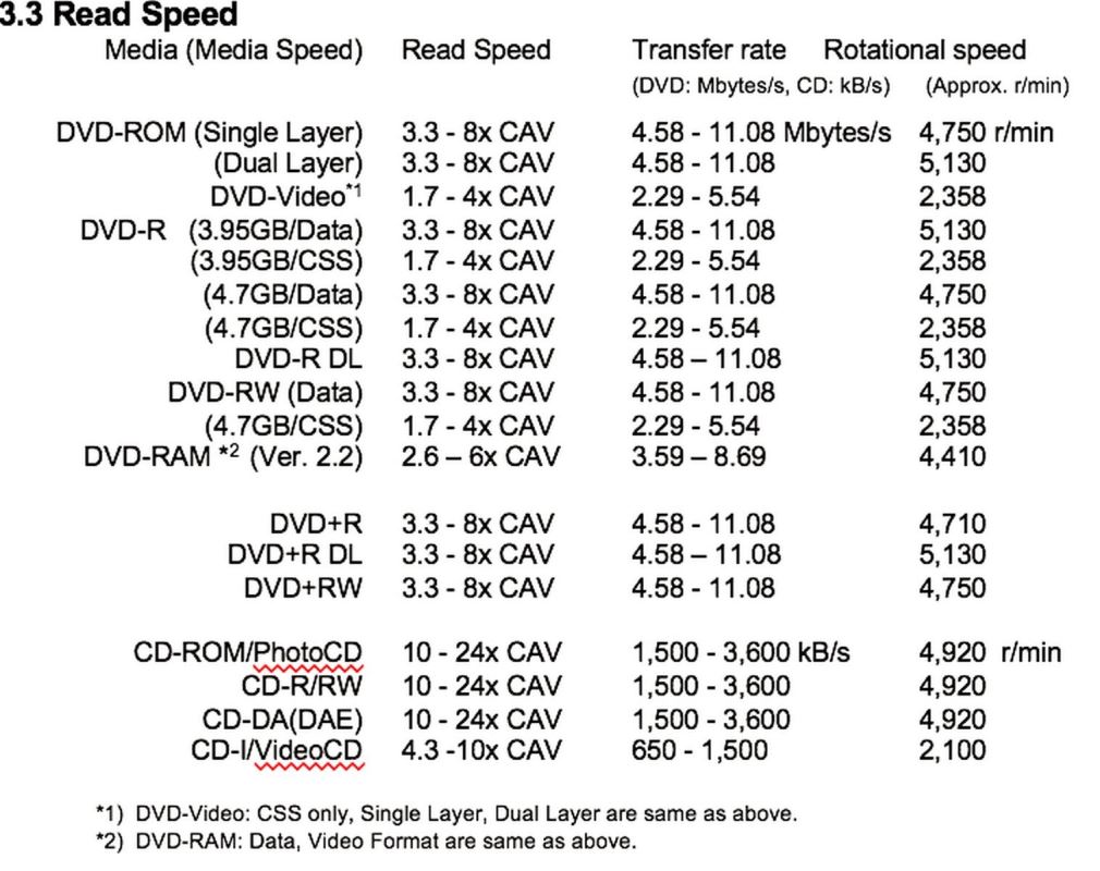 Podporuje 12cm (standardní) a 8cm (mini) disky CD a DVD. Obsahuje technologii ochrany proti podtečení zásobníku.