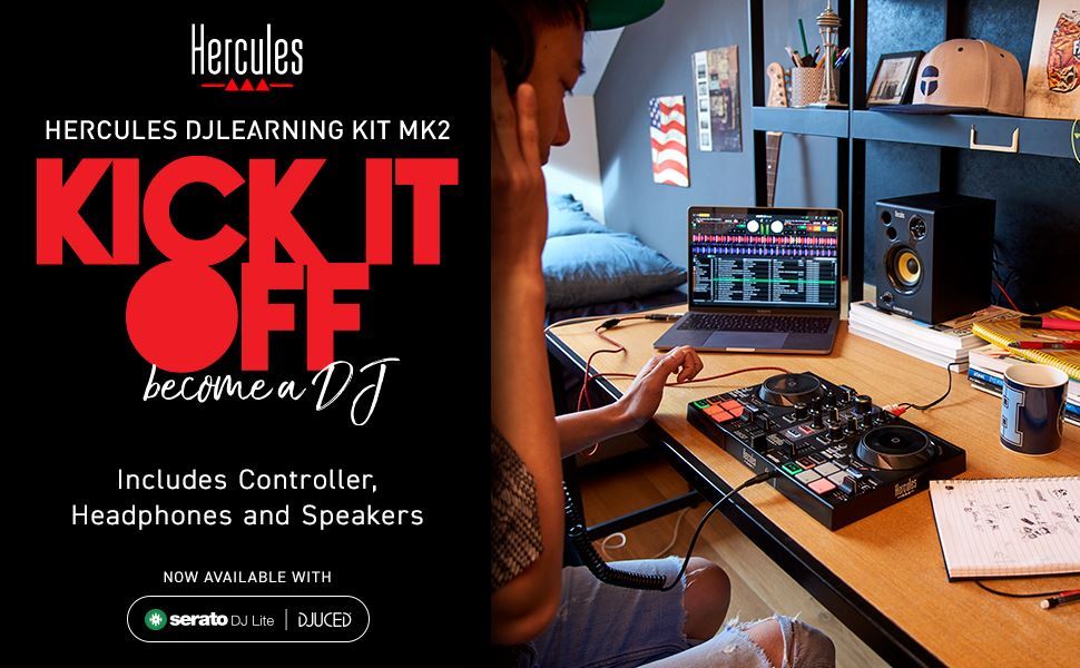 Hercules DJLearning Kit je dokonalá souprava pro začínající DJe. Sestava vše v jednom, která vám napomůže naučit se mixovat hudbu, a stát se DJem.