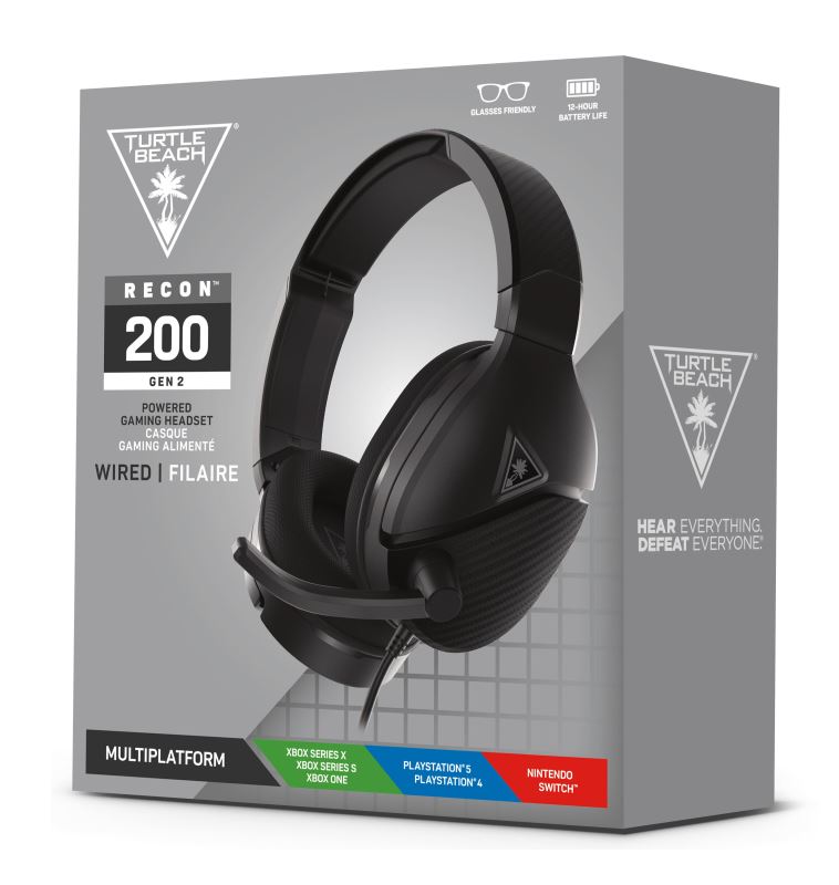 Sluchátka Turtle Beach® Recon™ 200 Gen 2 jsou multiplatformní herní sluchátka s 3,5mm jackem pro připojení, navíc jsou napájená dobíjecí baterii s 12hodinovou výdrží.