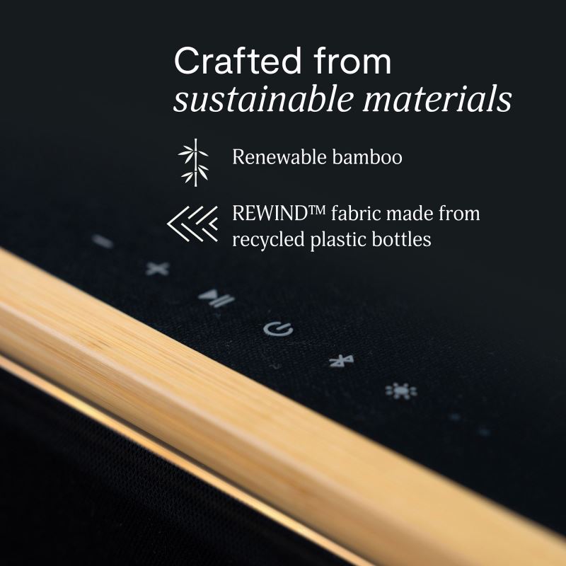Elegantní design kombinuje bambus a REWIND™ textilii z recyklovaných materiálů, čímž podtrhuje závazek k udržitelnosti.