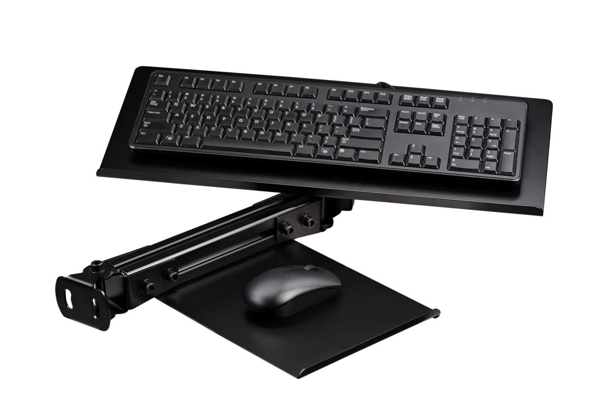 Stojanek na klávesnici a myš nabízí celé spektrum nastavitelnosti, s 60 stupni náklonu na montážním rameni (30 stupňů vpředu a 30 stupňů vzadu) a 150 stupňů pro desku klávesnice.