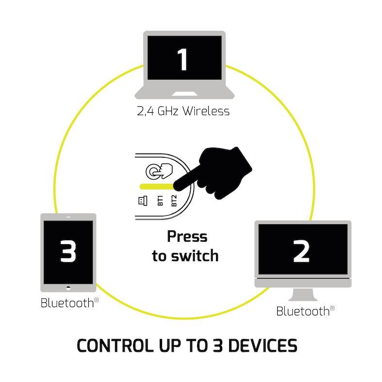 Díky duálnímu připojení Bluetooth® a 2,4 GHz umožňuje současné připojení až ke třem zařízením.
