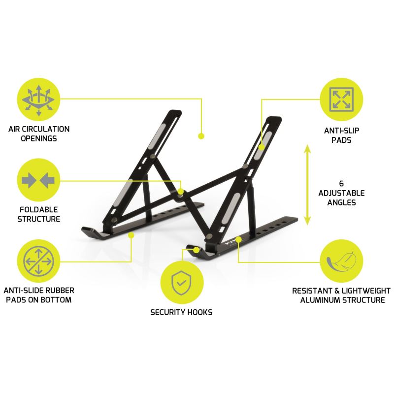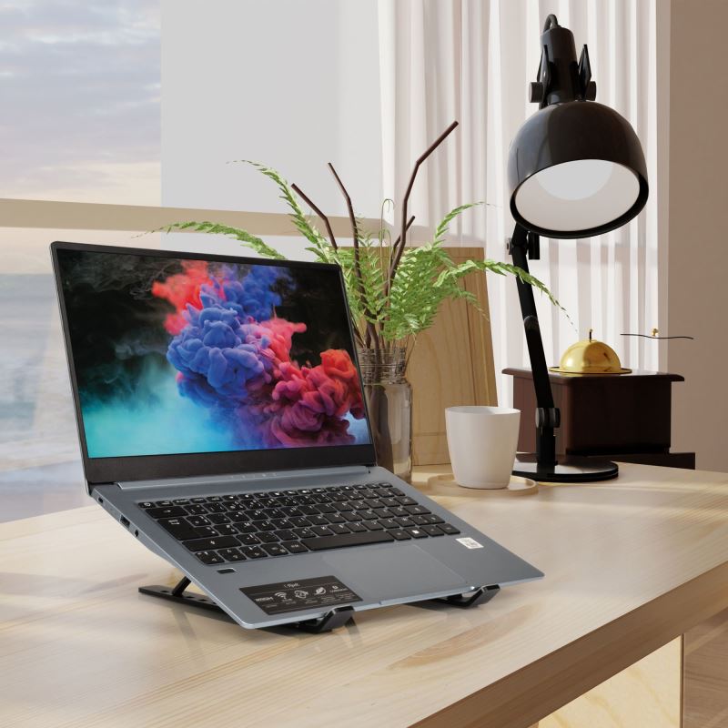 Ergonomická skládací hliníkový stojan na notebook pro NB o velikosti 10-15,6". Po složení jej snadno zabalíte sebou na cesty.
