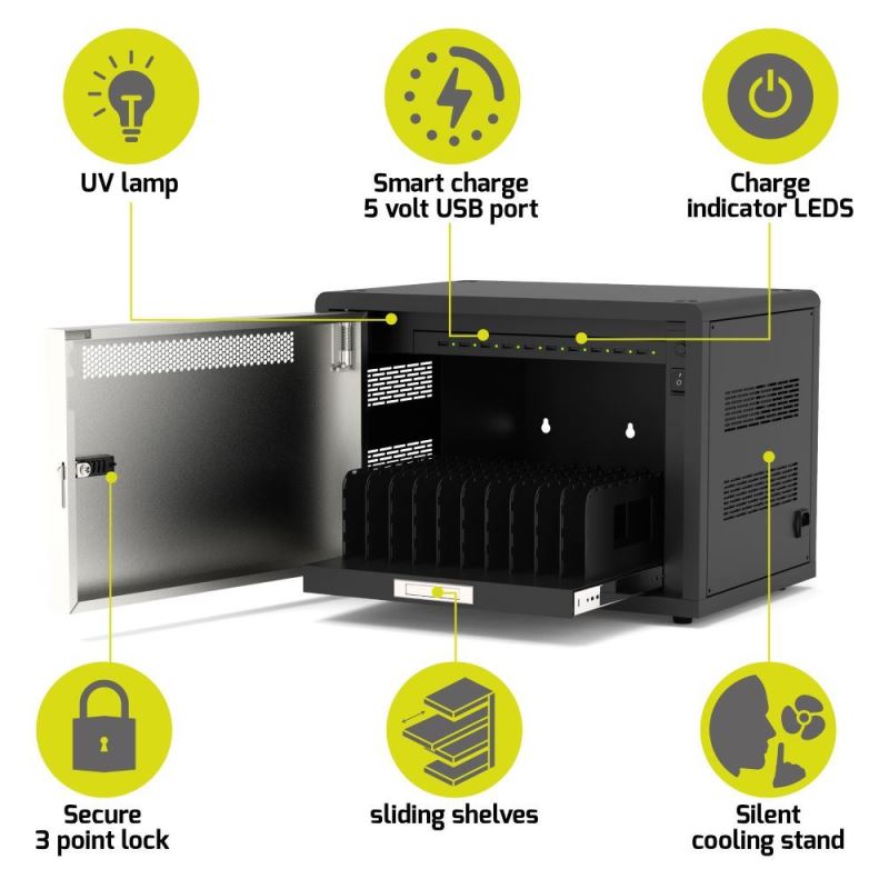 Skříň je vybavena ultrafialovými (UV) lampami, které se aktivují při zavření dveří. UV záření účinně ničí viry a bakterie. UV lampy mají dekontaminační účinek proti patogenům přítomným na zařízeních při jejich nabíjení.