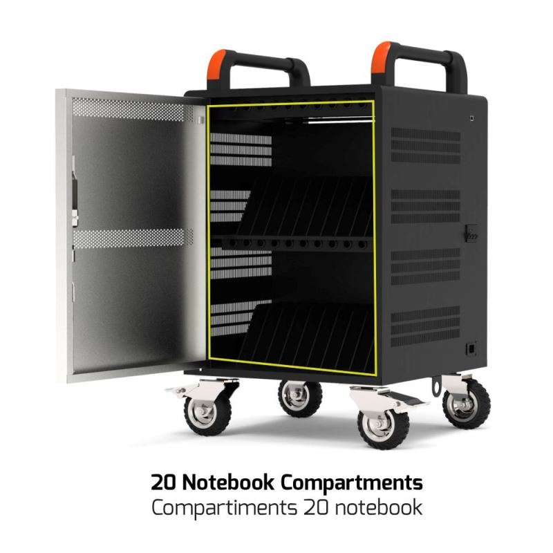 Skříň obsahuje na zadní straně 20 síťových zásuvek pro napájení notebooků. Tichý systém se samoventilačním ventilátorem s řízenou teplotou umožňuje chladit NB během nabíjení.