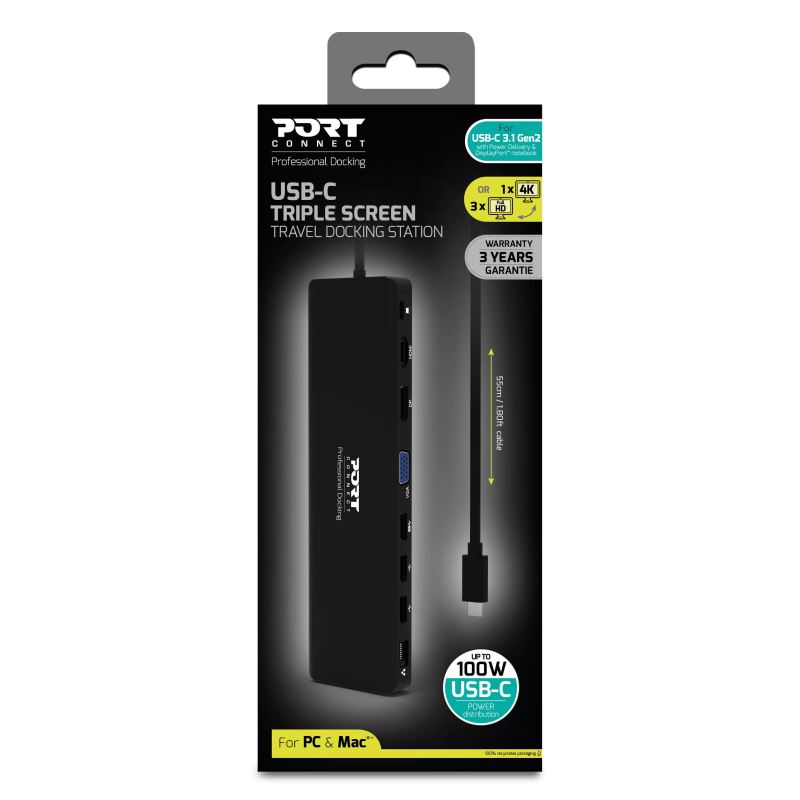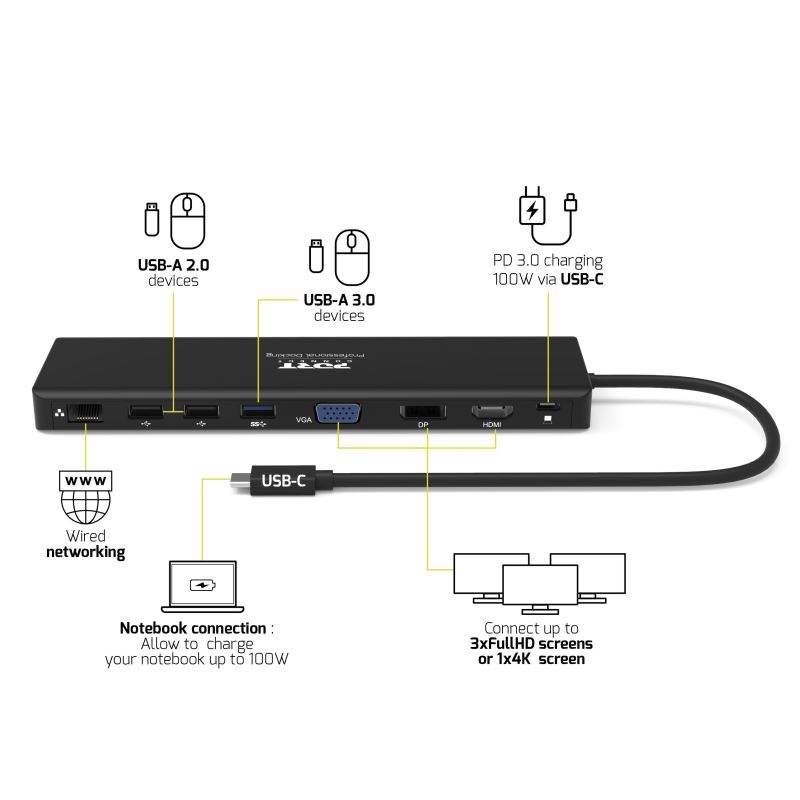 PORT CONNECT Dokovací stanice 11v1, 1x4K, RJ45,HDMI,Display Port,VGA,USB-C 100W, 4xUSB-A,micro/SD
