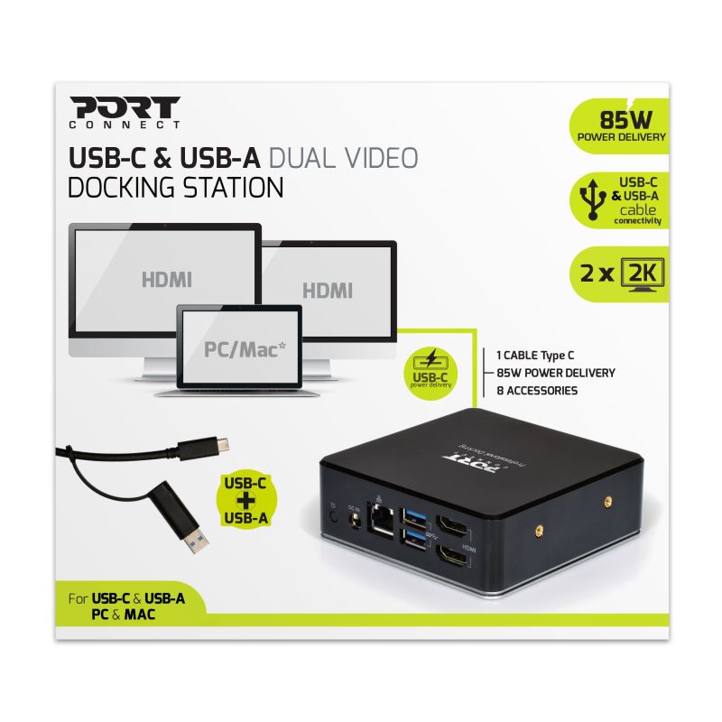 PORT CONNECT Dokovací stanice 8v1 USB-C, USB-A, dual video, HDMI, Ethernet, audio, USB 3.0