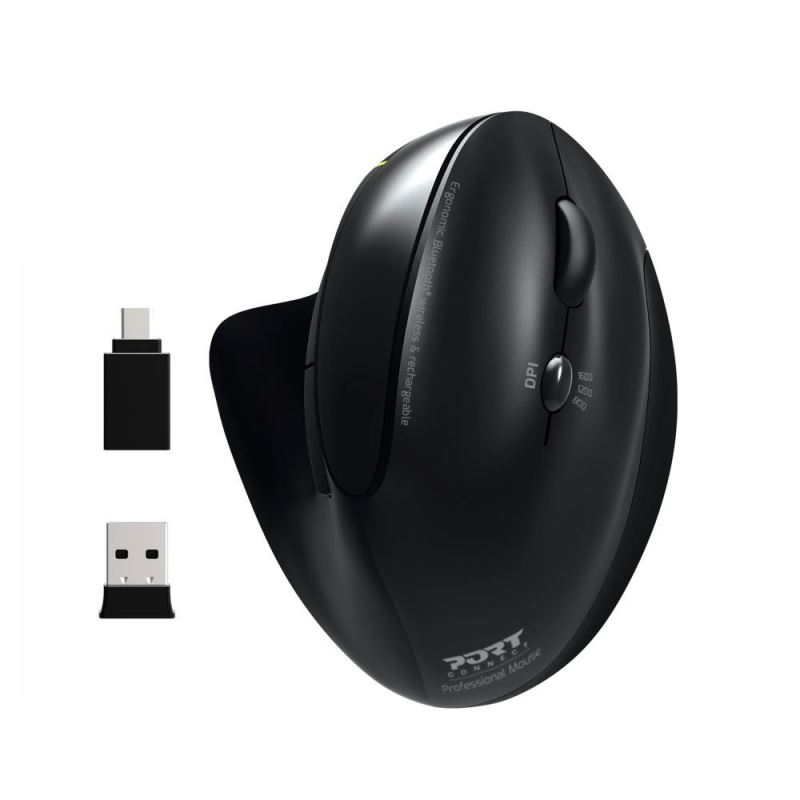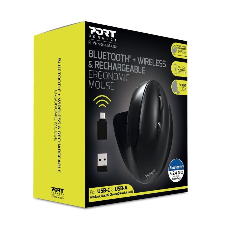 PORT CONNECT ERGONOMIC RECHARGEABL, bezdrátová ergonomická myš, 2,4 Ghz a Bluetooth®, USB-A/C, černá