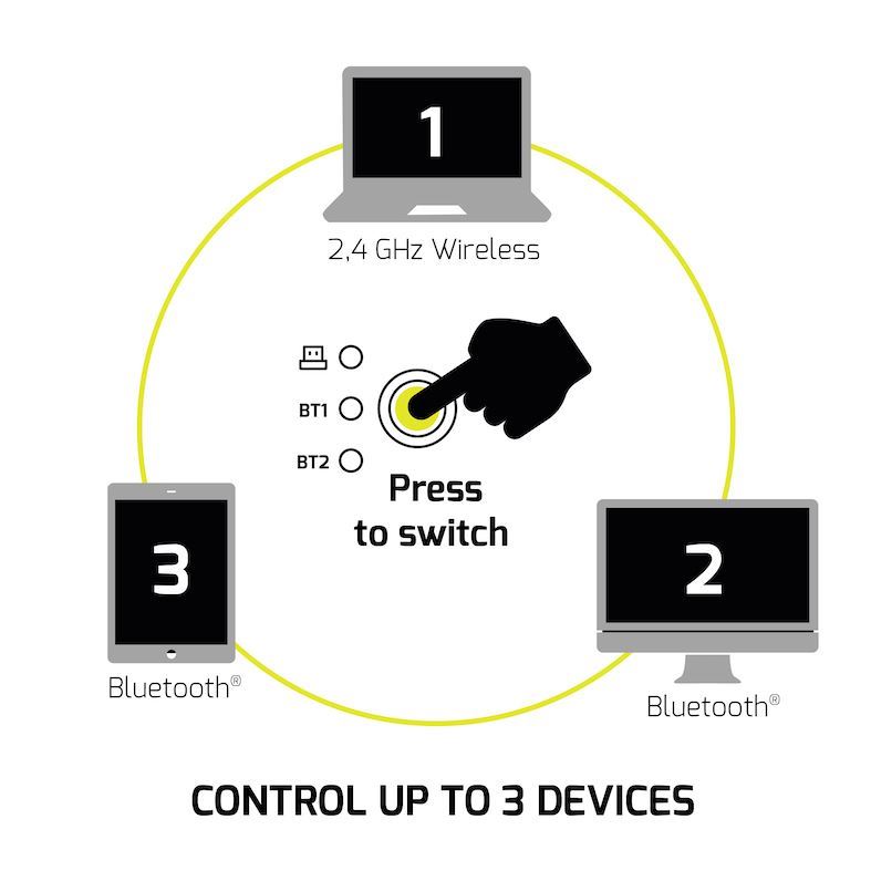 Myš se může připojit současně ke 3 samostatným zařízením: jedno přes 2,4 GHz technologii a dvě další přes Bluetooth®. Ideální řešení pro multitasking pracující na více podporách najednou.