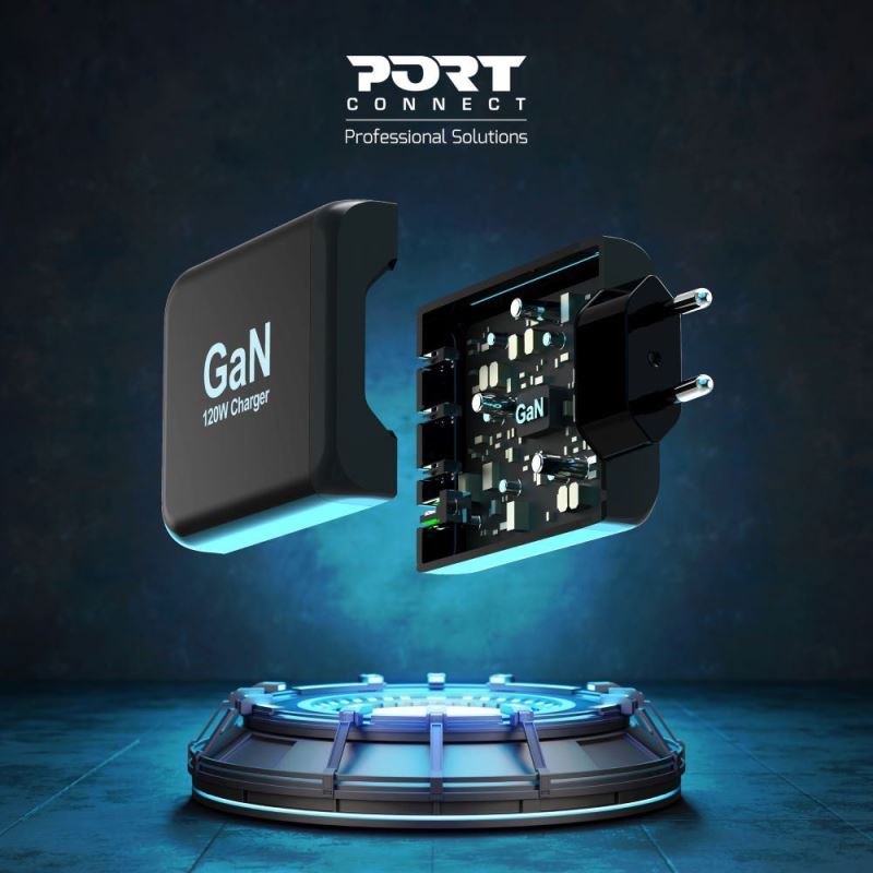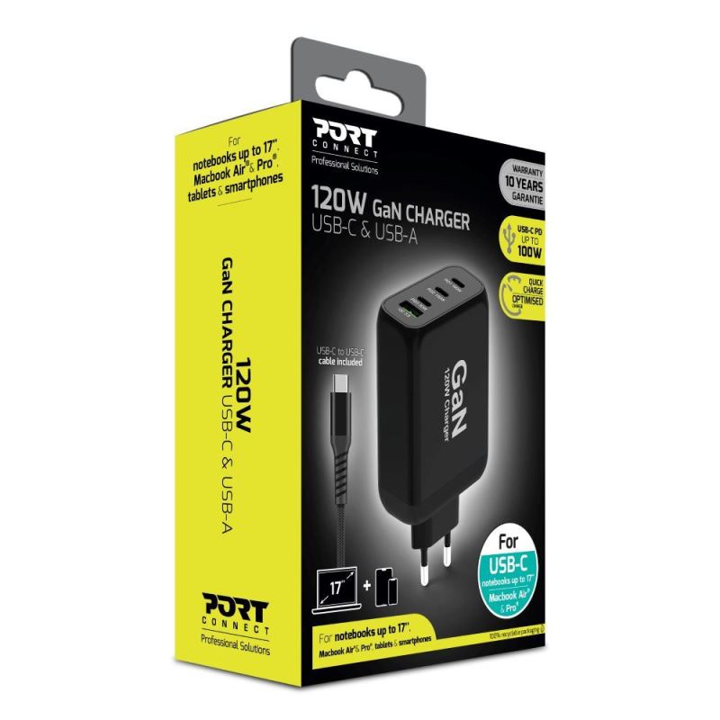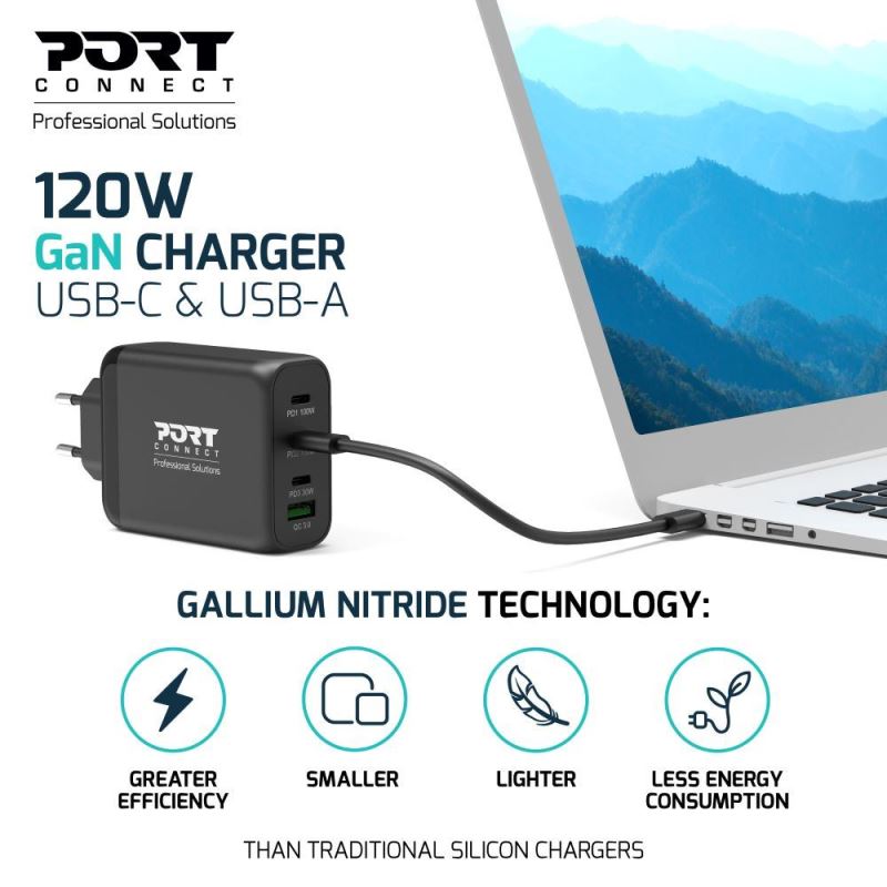 PORT CONNECT Síťová nabíječka 120 W GaN ,USB-C a USB-A, s technologií Gallium Nitride (GaN): účinnější, menší, lehčí s nižší spotřebou a 10 letou zárukou.