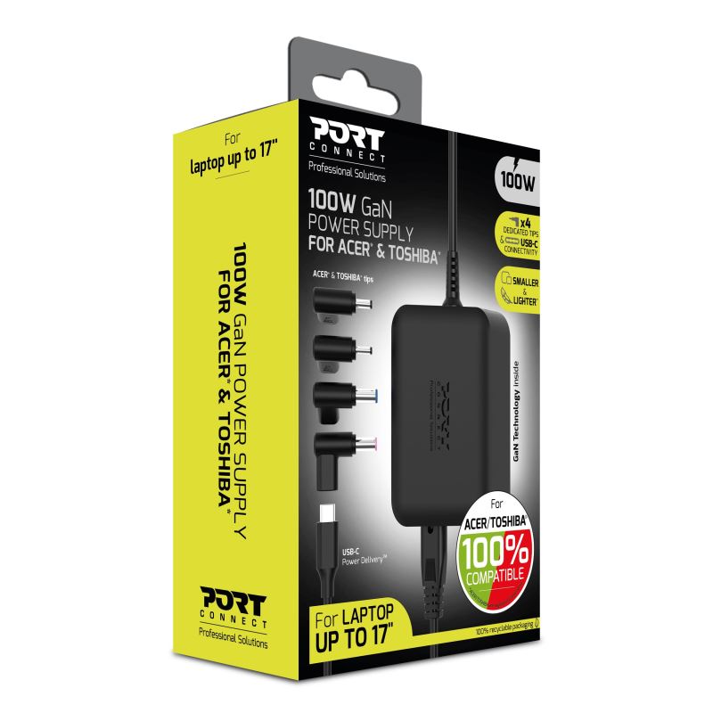 PORT CONNECT GaN2 100 W představuje náhradní síťový napájecí adaptér navržený pro notebooky ACER a TOSHIBA využívající proprietární napájecí konektory.