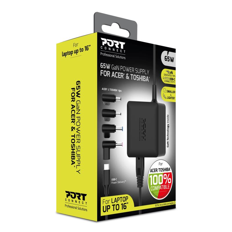 PORT CONNECT GaN2 65 W představuje náhradní síťový napájecí adaptér určený pro notebooky značek ACER a TOSHIBA využívající proprietární napájecí konektory.