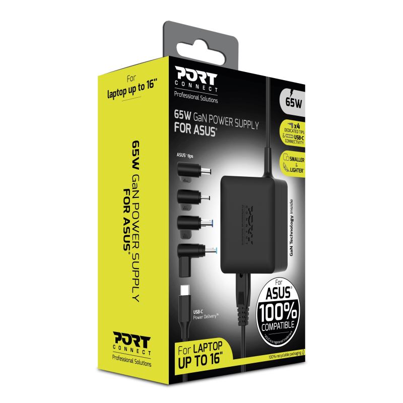 PORT CONNECT GaN2 síťový napájecí adaptér - Kompaktní 65W napájecí adaptér s technologií GaN2 navržený pro notebooky ASUS do velikosti 16".