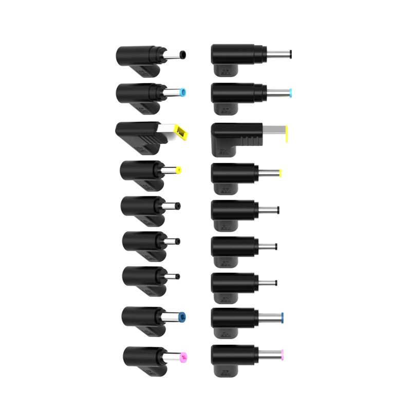 Součástí balení je sada devíti vyměnitelných napájecích koncovek, které rozšiřují kompatibilitu s notebooky různých značek.