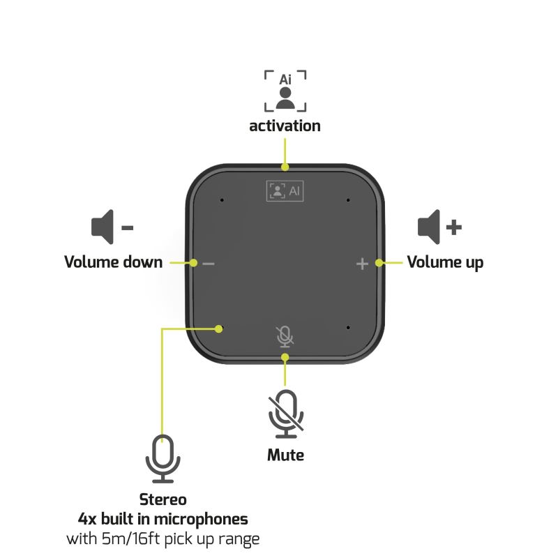 - Vše v jednom: Kamera, mikrofony a reproduktor v jednom zařízení.