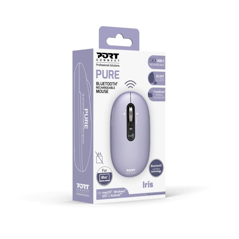 PORT CONNECT Pure MAC, bezdrátová dobíjecí myš, Bluetooth, FreeWheel, 3200 DPI, fialová
