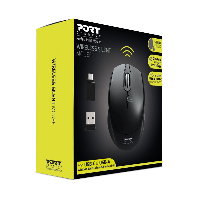 PORT CONNECT SILENT, bezdrátová myš, USB-A/USB-C dongle, 2,4Ghz, 1600DPI, černá