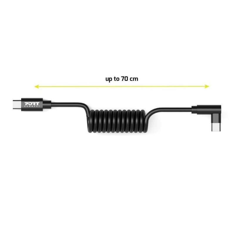 Prodlužovací pružinový, synchronizační a nabíjecí kabel. USB-C 90° do USB-C. Distribuce energie až 65W.