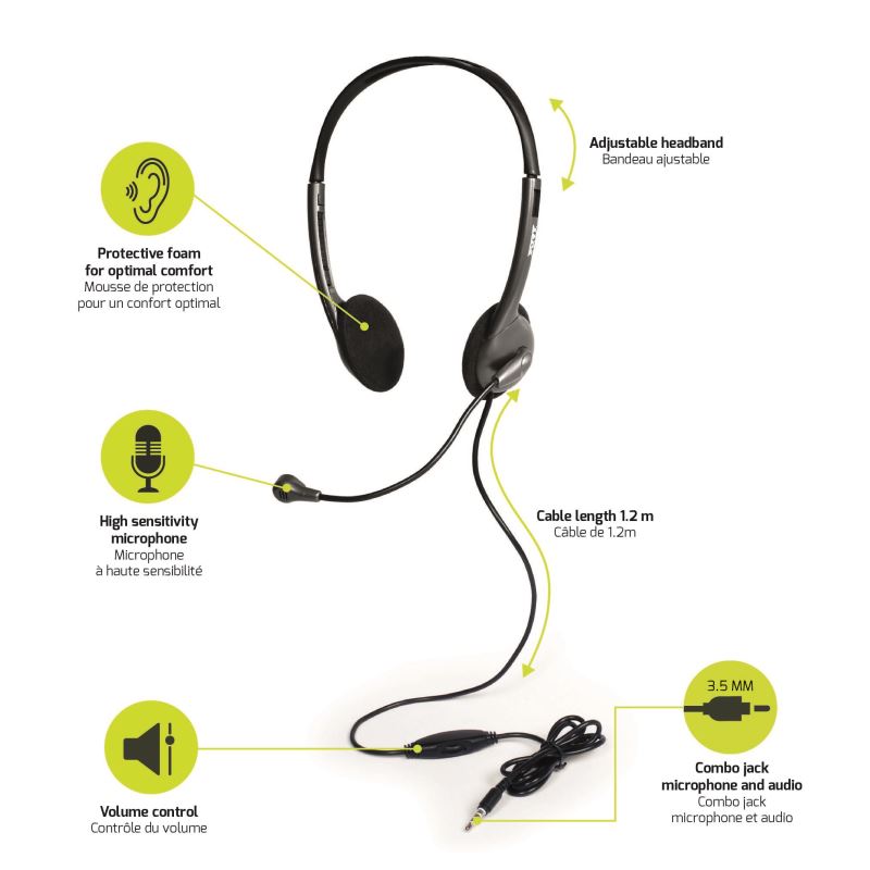 Májí ovladač hlasitosti na kabelu, které je dlouhý 1,2 m. Čelenka je nastavitelná tak, aby vyhovovala co největšímu počtu lidí.