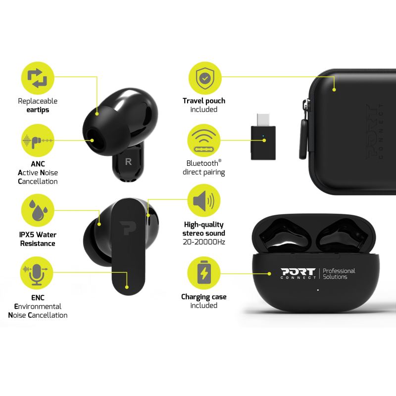 PORT CONNECT WALKER PRO Bluetooth® stereo earbuds nabízejí dvě možnosti připojení – přímé Bluetooth® párování a Plug & Play provoz pomocí přiloženého USB-C přijímače.