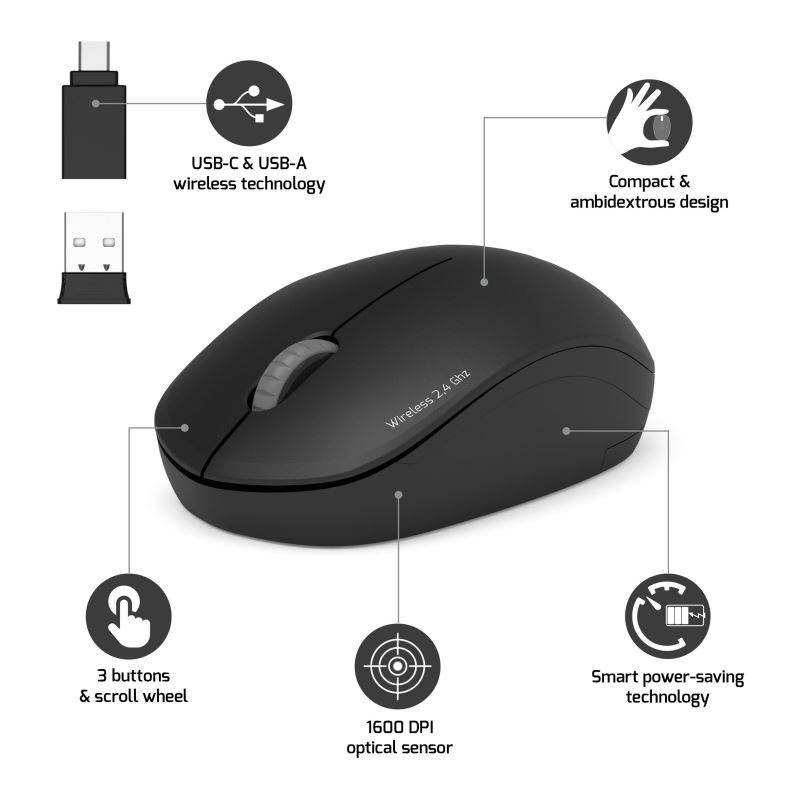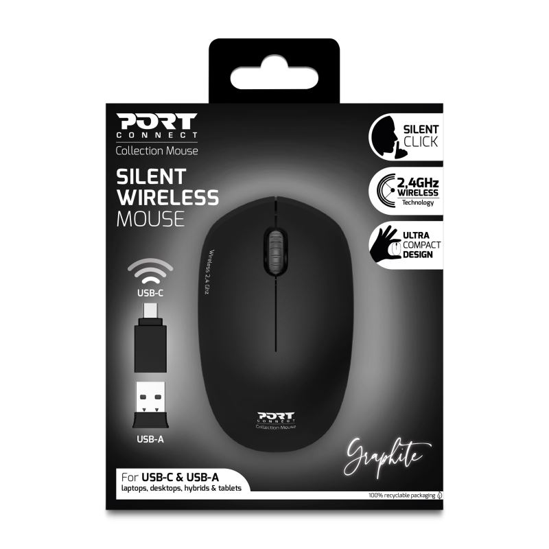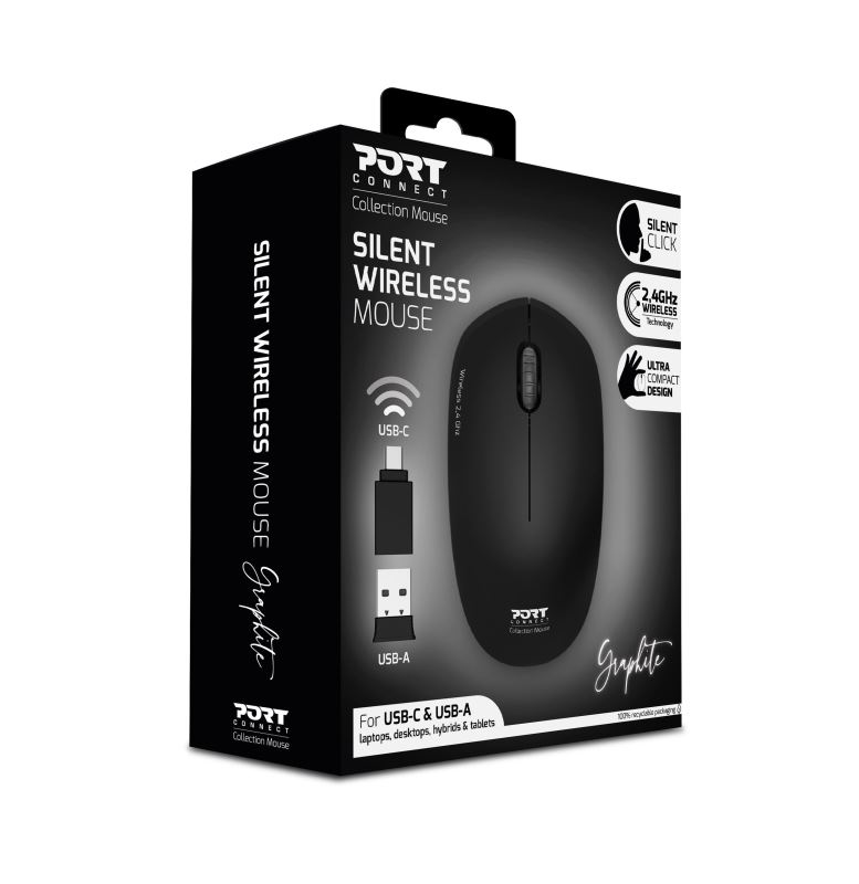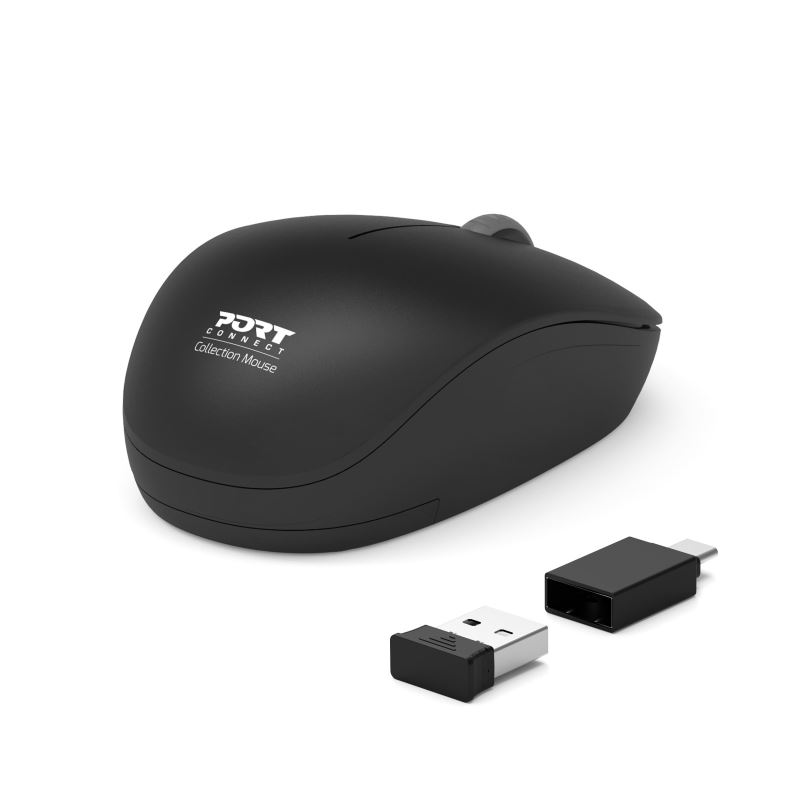 PORT CONNECT Wireless COLLECTION, bezdrátová myš, USB-A a USB-C dongle, 2.4Ghz, 1600DPI, černá