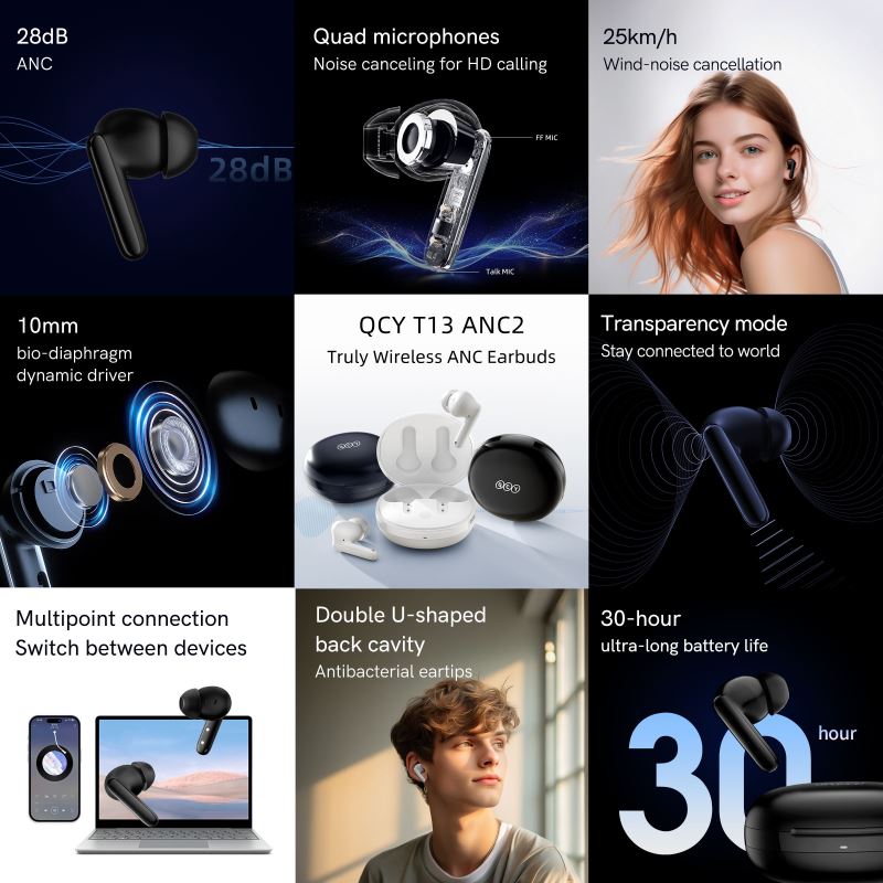 Bezdrátová sluchátka QCY T13 ANC 2 přinášejí vyvážený zvuk a pokročilou technologii potlačení hluku (ANC) s účinností až 28 dB, takže se můžete plně soustředit na hudbu nebo hovory.