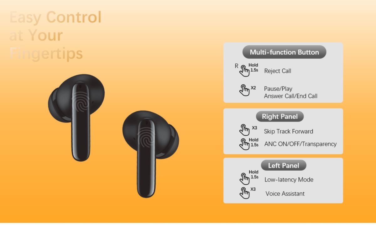 Pomocí dotykového ovládání snadno přepnete mezi režimy ANC, Transparency či Low Latency, přehrajete hudbu nebo přijmete hovor.