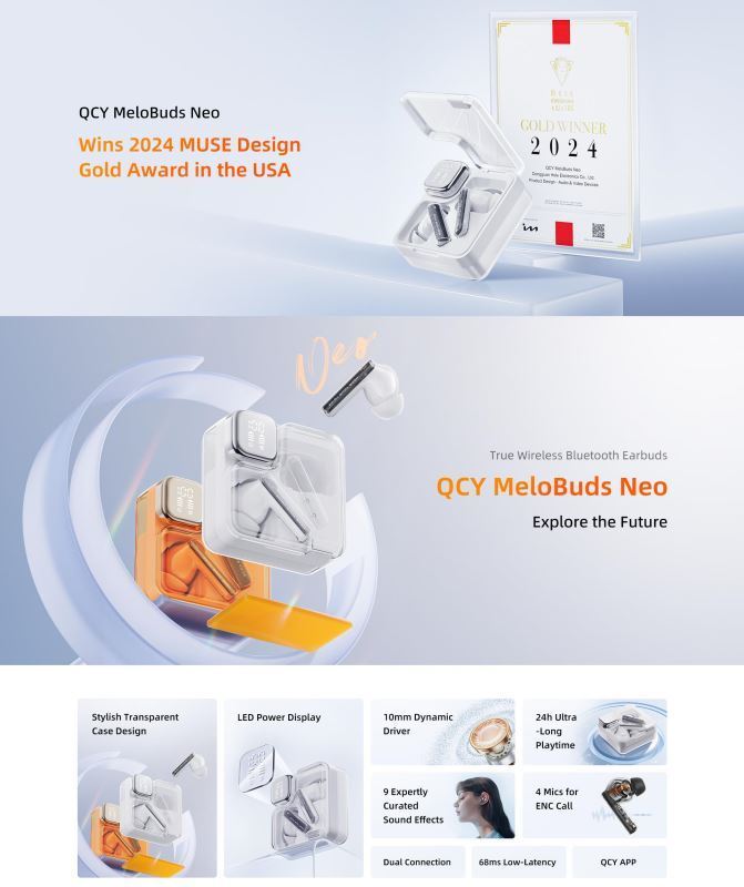 Elegantní, plně transparentní nabíjecí pouzdro v cyberpunkovém stylu a technicky inspirovaný design sluchátek dělají z QCY MeloBuds Neo modní doplněk, který skutečné vyniká.