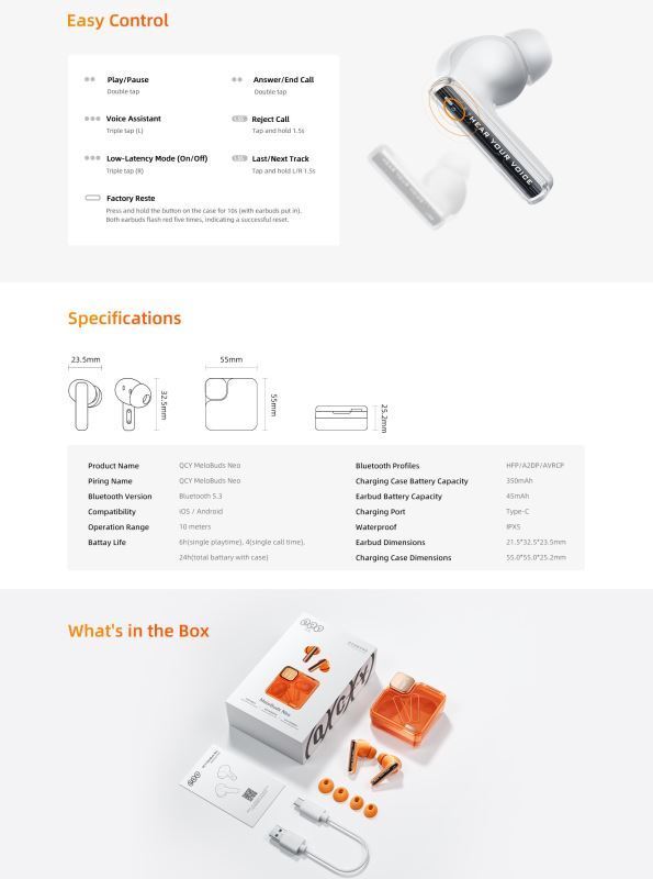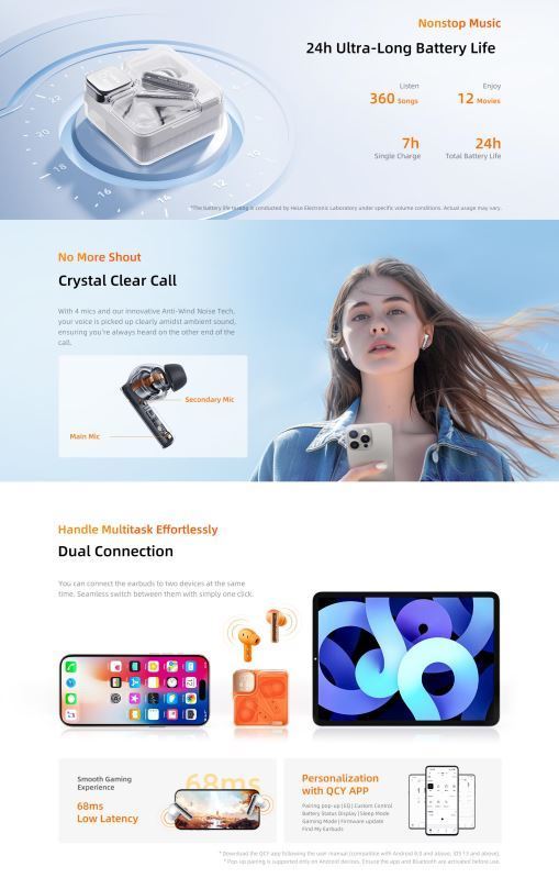 QCY T31 využijete ve všech denních situacích. Perfektně poslouží pro poslech oblíbené hudby, díky 4 vestavěným mikrofonům a aktivnímu potlačení okolního hluku a šumu mikrofonu vám umožní i pohodlné telefonování, skvěle se hodí i na sport, vzhledem k tomu, že jsou odolná potu a stříkající vodě.
