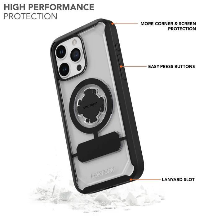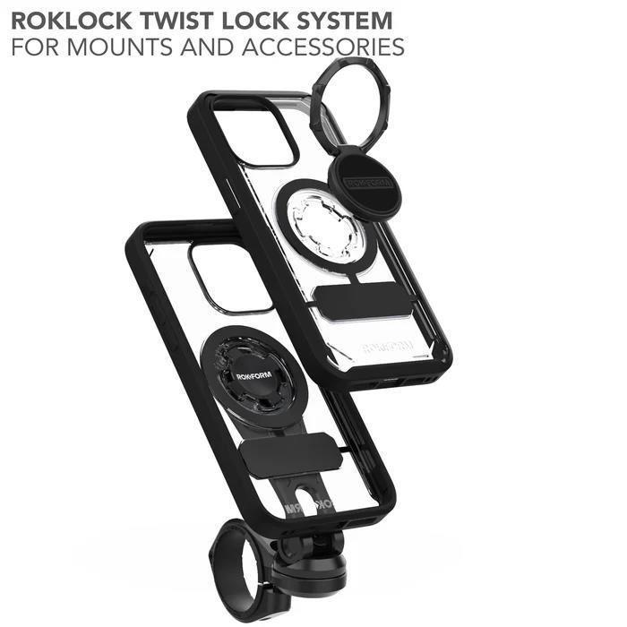 Čiré pouzdro na iPhone 15 Pro Max je kompatibilní se všemi magnetickými držáky ROKFORM a RokLock® twist lock držáky, ideální pro auta, nákladní auta, kola, motocykly, golfové vozíky a další.