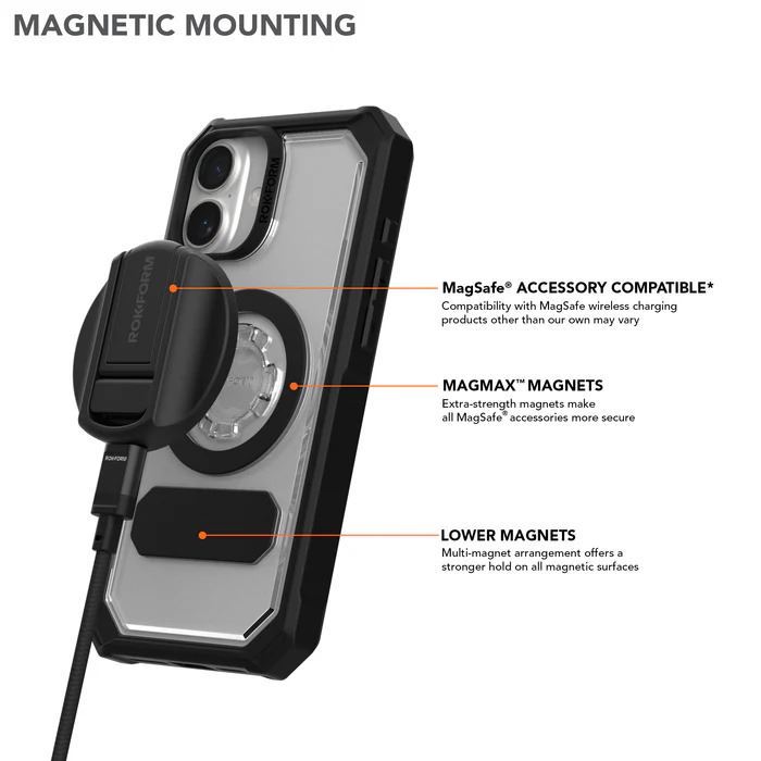 Čiré pouzdro na iPhone je kompatibilní se všemi magnetickými držáky ROKFORM a RokLock® twist lock držáky, ideální pro auta, nákladní auta, kola, motocykly, golfové vozíky a další.