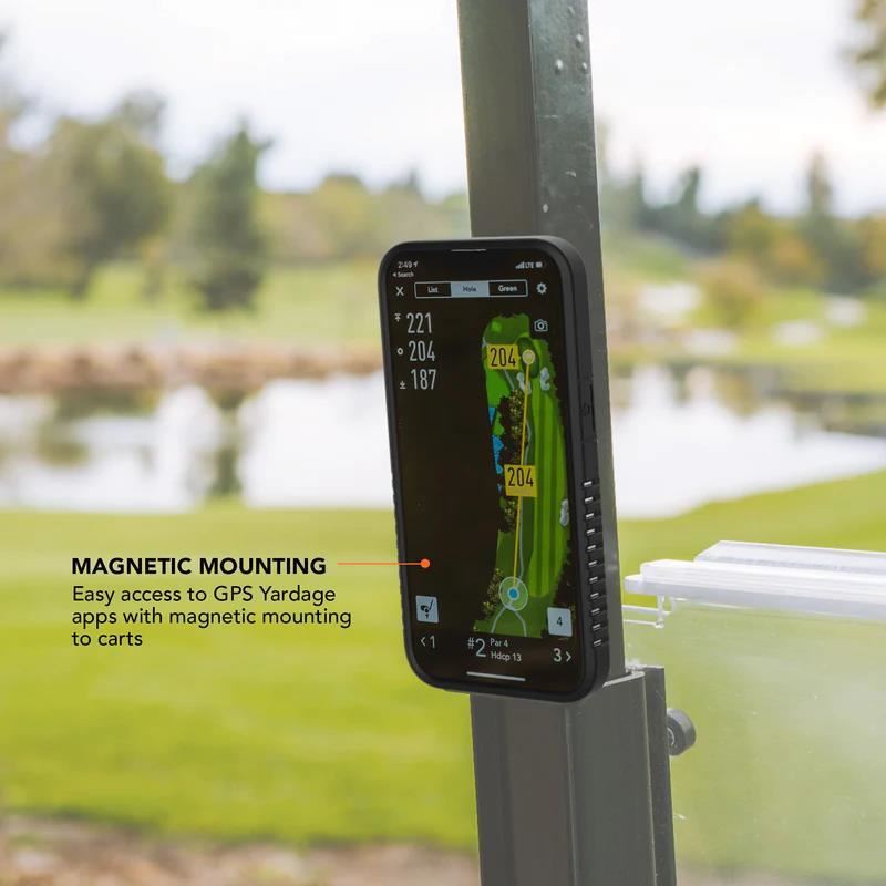 ROKFORM, který vykazuje tažnou sílu 19 liber, navrhl pouzdro tak, aby se bezpečně nalepilo přímo na malé kovové rameno, které podpírá střechu typického golfového vozíku, a efektivně tak udrží iPhone přímo v úrovni očí a mimo golfový bag, kapsy nebo odkládací schránka – bude také stále fungovat s typickými nabíječkami MagSafe.