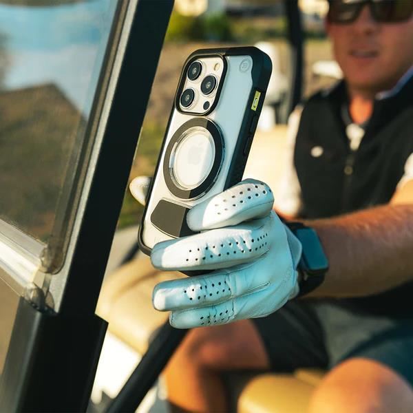 ROKFORM navrhl pouzdro tak, aby se bezpečně nalepilo přímo na malé kovové rameno, které podpírá střechu typického golfového vozíku, a efektivně tak udrží iPhone přímo v úrovni očí a mimo golfový bag, kapsu nebo odkládací schránku – bude také stále fungovat s typickými nabíječkami MagSafe.
