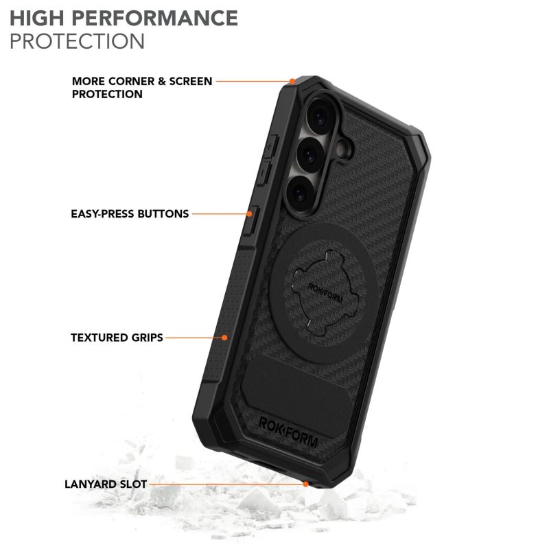 Pouzdro Rokform Rugged Galaxy pro S25 serie chrání váš telefon kombinací nárazuvzdorného polykarbonátu a TPU tlumícího nárazy.