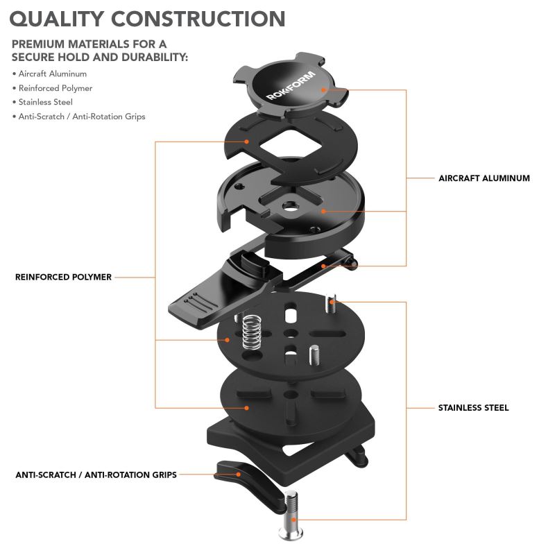 - S držákem ROKFORM je váš telefon v bezpečí, a to díky patentovanému systému RokLock™ Twist, který umožňuje snadno nasadit a sejmout telefon během několika vteřin