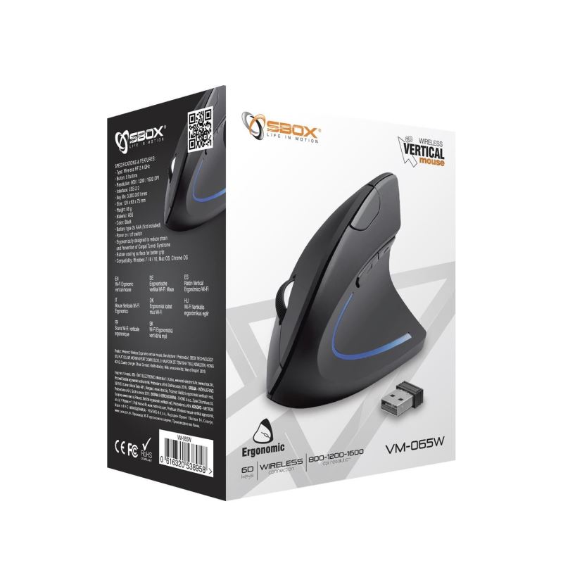 SBOX vertikální bezdrátová myš, 1600dpi, černá (VM-065)