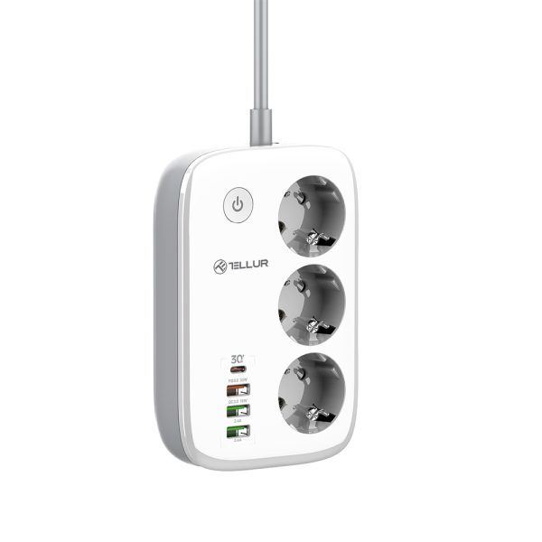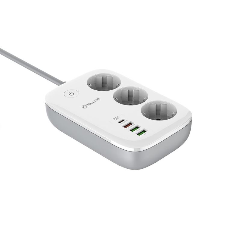 Tellur WiFi Smart Power Strip, 3x zásuvka, 2x USB 2.4A, 1x USB QC18W, 1x USB-C PD30W, 2m, bílá