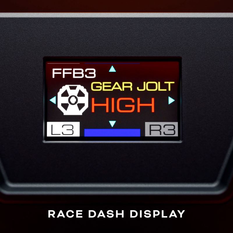 Vestavěný Race Dash displej umožňuje nastavovat a ukládat profily Force Feedback přímo na základně a zároveň v kompatibilních hrách zobrazovat telemetrická data, jako je rychlost, nejlepší časy, pozice nebo závodní vlajky.