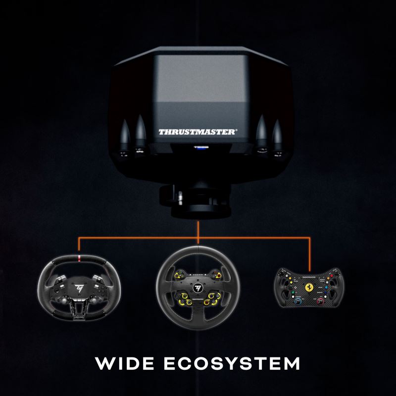 T598 Servo Base je plně kompatibilní s ekosystémem Thrustmaster, včetně odnímatelných věnců (F1, GT, rally), pedálových sad (T-LCM, T3PM, Raceline LTE), řadicích pák (TH8S, TH8A) a ručních brzd (TSS Handbrake). Díky standardním montážním otvorům a kompatibilitě s deskovými i kokpitovými držáky je připravena pro všechny typy setupů.
