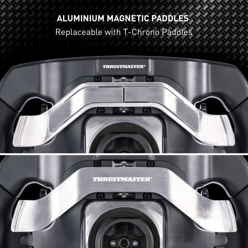 Struktura čelní desky z 100% karbonového vlákna zajišťuje vyváženou odezvu Force Feedback s mimořádně přesným ovládáním, zejména v hrách zaměřených na jednomístné monoposty. Texturované gumové úchopy a vyměnitelné magnetické řadicí páčky Thrustmaster T-Chrono Paddles (prodávají se samostatně) dělají z této repliky univerzální závodní nástroj, který se snadno přizpůsobí potřebám každého jezdce.
