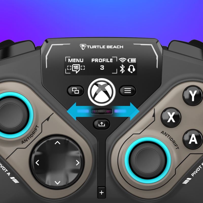 Pro úpravy ve zlomku sekundy ve hře je uprostřed ovladače na dosah ruky přepínač pro návrat do středu s přizpůsobitelným osvětlením RGB, který lze namapovat na funkce, jako je nastavení hlasitosti náhlavní soupravy.