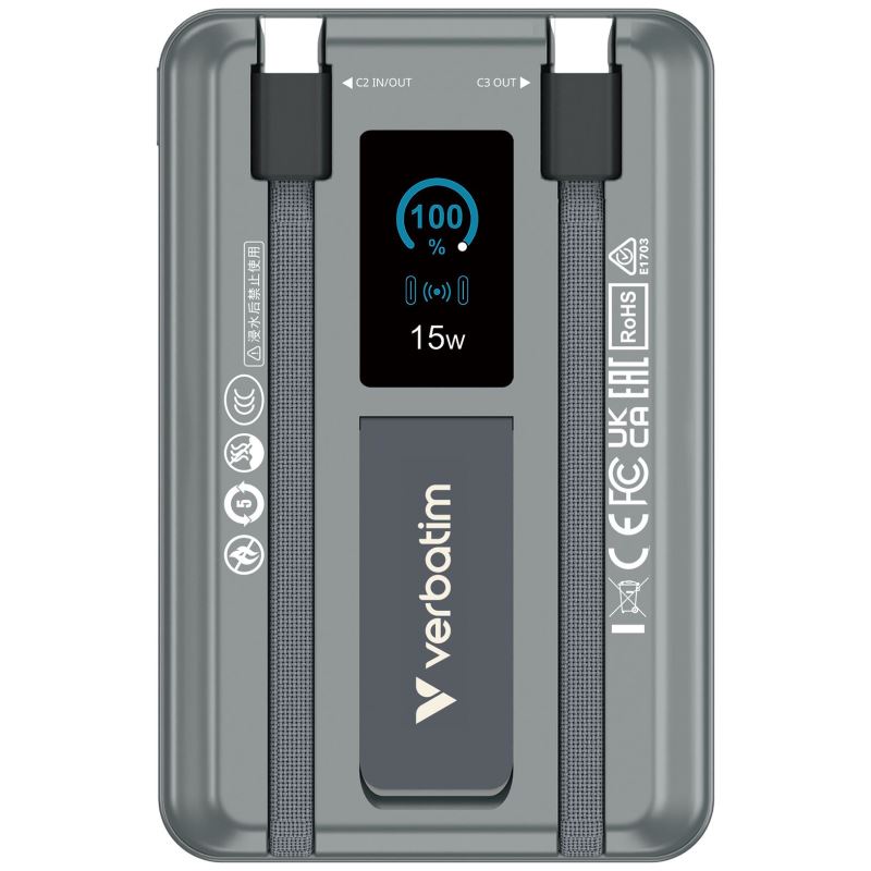 Prémiová powerbanka Verbatim s bezdrátovým magnetickým nabíjením, vestavěnými kabely a chytrým TFT displejem.
