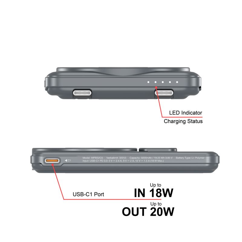 Verbatim magnetická bezdrátová powerbanka se stojánkem Charge 'n' Go 2C, 5000mAh, 2× USB-C, šedá