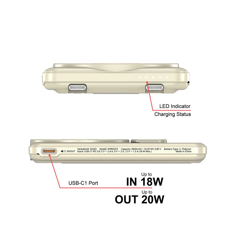 Verbatim magnetická bezdrátová powerbanka se stojánkem Charge 'n' Go 2C, 5000mAh, 2× USB-C, zlatá