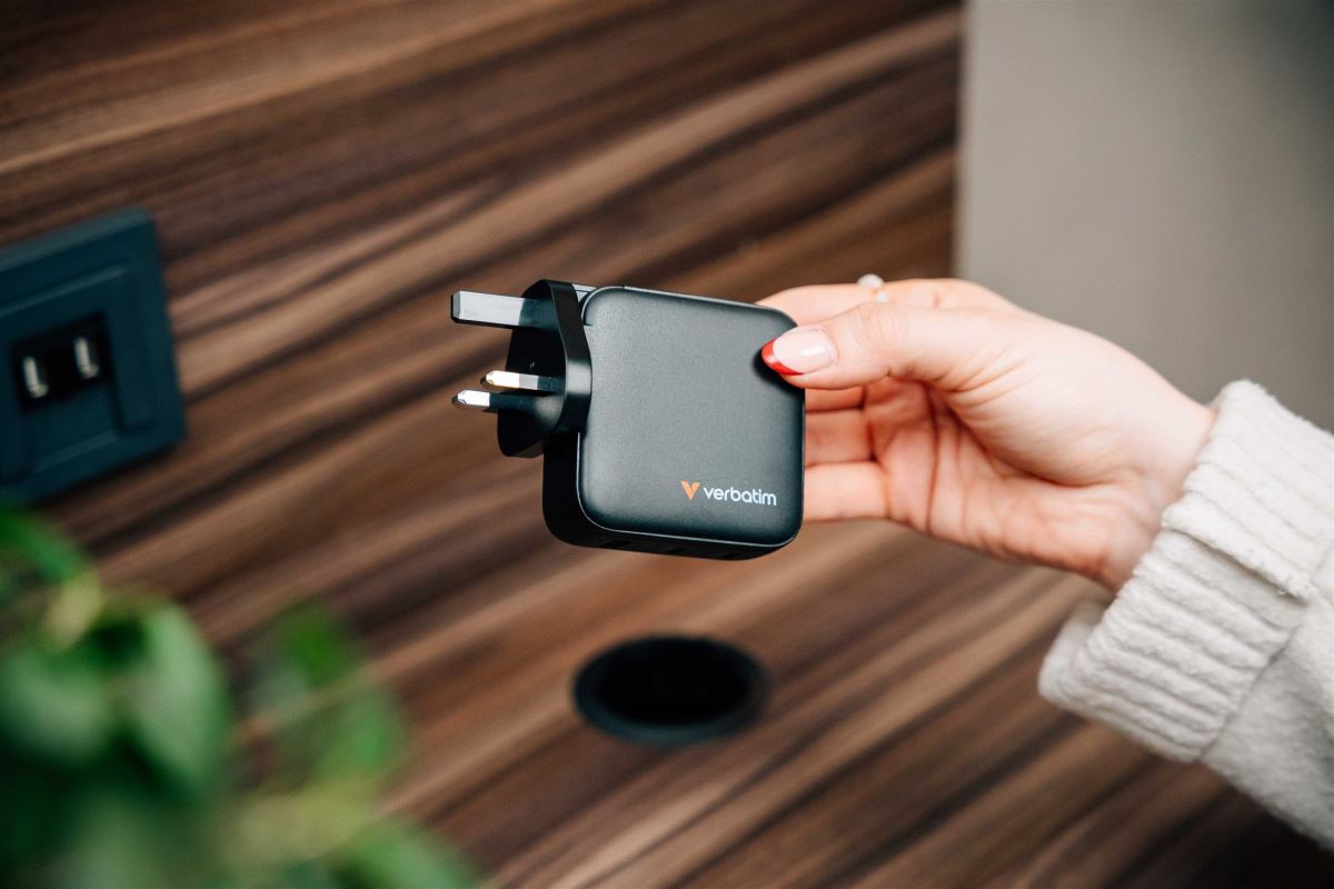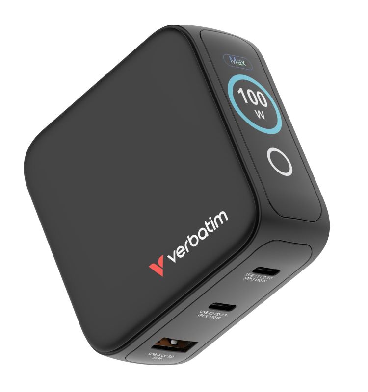 Kompaktní síťová nabíječka Verbatim s technologií GaN nabízí vysoký výkon až 100 W, přehledný TFT displej a možnost současného nabíjení více zařízení.