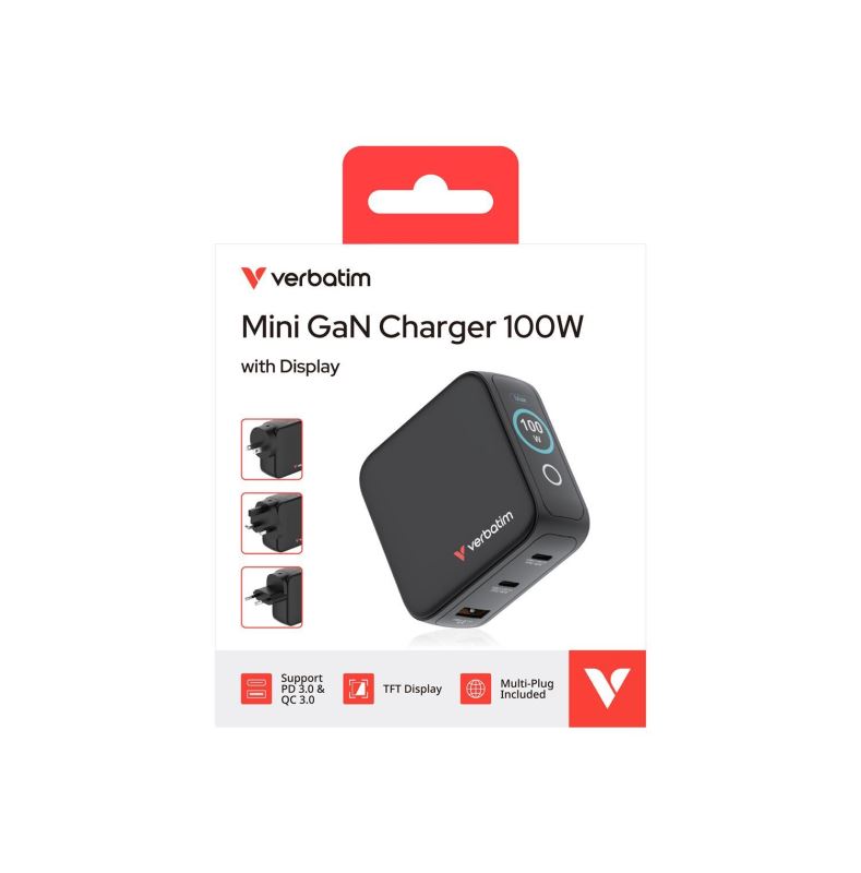 - Verbatim Mini GaN nabíječka s displejem, 2× USB-C PD 100 W, 1× USB-A QC 3.0, černá